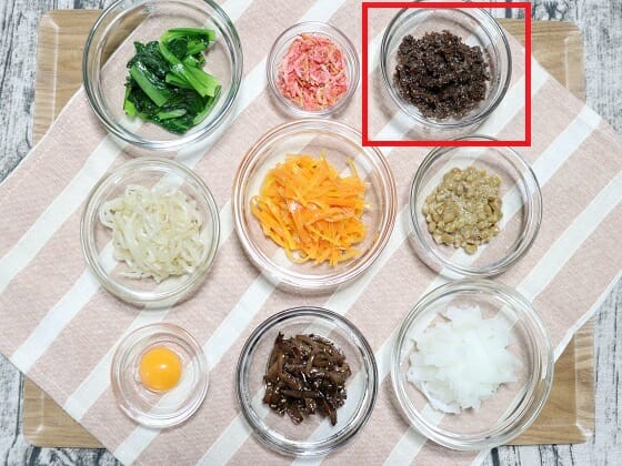 肉がある事によってよりビビンバの味わいを増す事が出来、また見た目も良くなります。本来であれば、ひき肉を使用した方が良いですが、ここでは応用として、牛肉のこま切れ肉をミンチ状にしてご紹介致します。