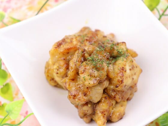 はちみつには浸透性があり、ブドウ糖と果糖が肉の内側に浸み込んで、肉のタンパク質が凝集するのを防ぐので、焼く前に肉に絡めることによって、仕上がりを柔らかくする事が出来ます。鶏もも肉は元々が柔らかいので、今回は見た目の照りを重視していますが、鶏むね肉は焼くとパサパサになりやすいです。鶏むね肉を使用する場合は、先にはちみつマスタードを混ぜる事によってジューシーに仕上げる事が出来ます。塗り過ぎると、ベタベタになってしまうので、量にご注意下さい。