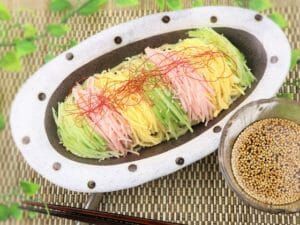 4. 器に麺を盛り付け、上に切ったきゅうり、ハム、錦糸卵を交互に盛り付け、白ごま、糸唐辛子を盛り付けたら完成です。