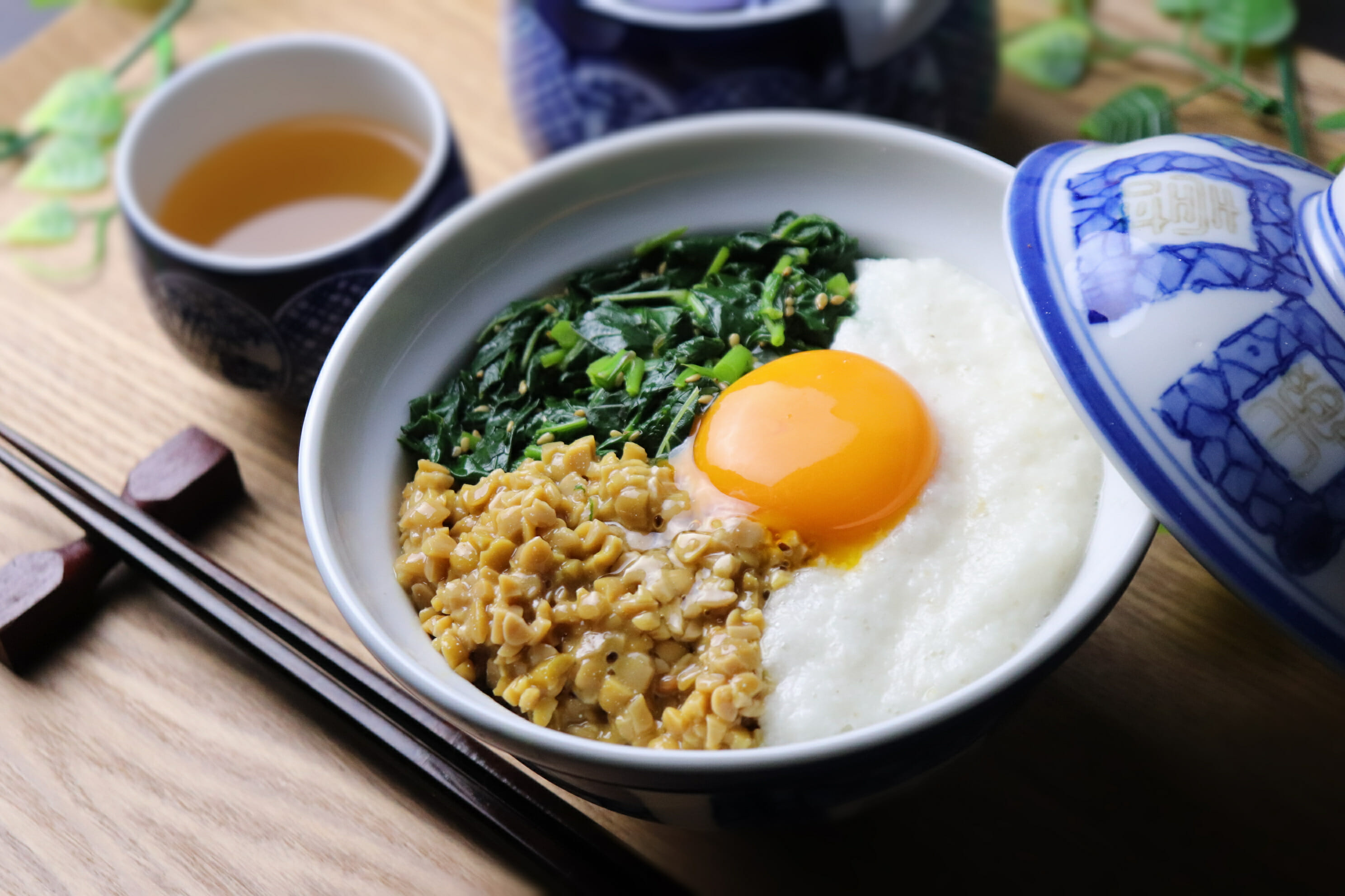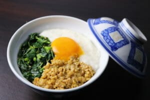- 温かいの白ご飯の上にモロヘイヤのナムル納豆とろろを乗せ、生卵を中央に乗せたら完成です。