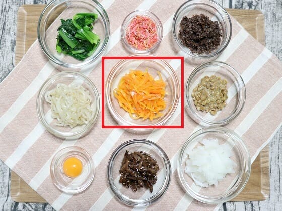 ビビンバの色取りとして、あるととてつもなく華やかなになる人参のナムル。今が旬な訳ではありませんが、ほぼ年中スーパーなどで出回っている人参だからこそ、ビビンバを作る際には加えて欲しい一品です。