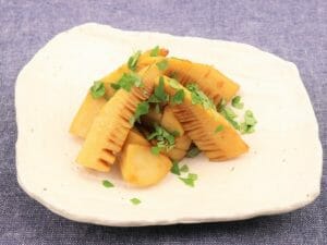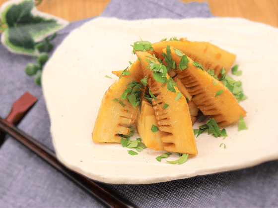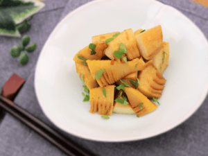 - 器に先に、炒めたタケノコを盛り付け、刻んだ木の芽を振りかけたら完成です。