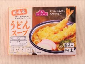 スーパーで販売しているうどんスープです。とてもコストパフォーマンスの高い商品で『関西風』と『関東風』があり今回は『関西風』を使用しました。