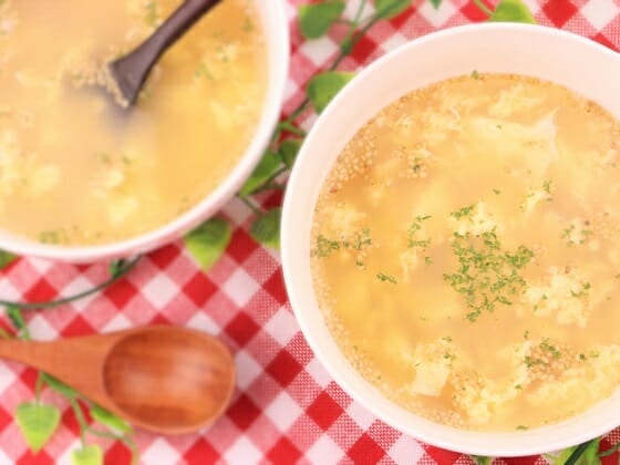 うどんスープの素を使用した卵スープです。今回は、主な具材は卵のみですが、キャベツや豆腐などの具材も入れても美味しく出来ますので、時間が無い時にもオススメです。