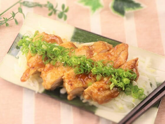 - 器に、スライスして水にさらした玉ねぎを下にしき、切った鶏肉の照り焼きをのせ、上にネギを乗せたら完成です。